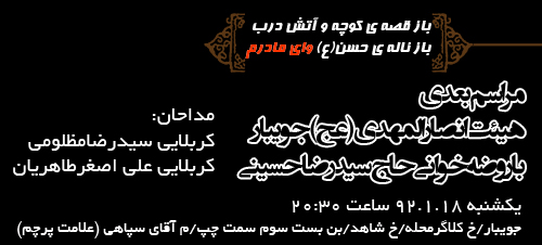 مراسم هفتگی هیئت انصارالمهدی (عج) شهرستان جویبار: سخنران: حاج آقا محرابیان مداح: کربلایی علی اصغر عرب و کربلایی سید رضا مظلومی زمان: شب های جمعه/ساعت 18 مکان: مازندران - جویبار - جوان محله - پایگاه شهید توکلی (بیت الشهدا) منتظر حضور گرم و همیشگی همه ی دل شکسته گان آقا اباعبدالله حسین(ع) هستیم ...